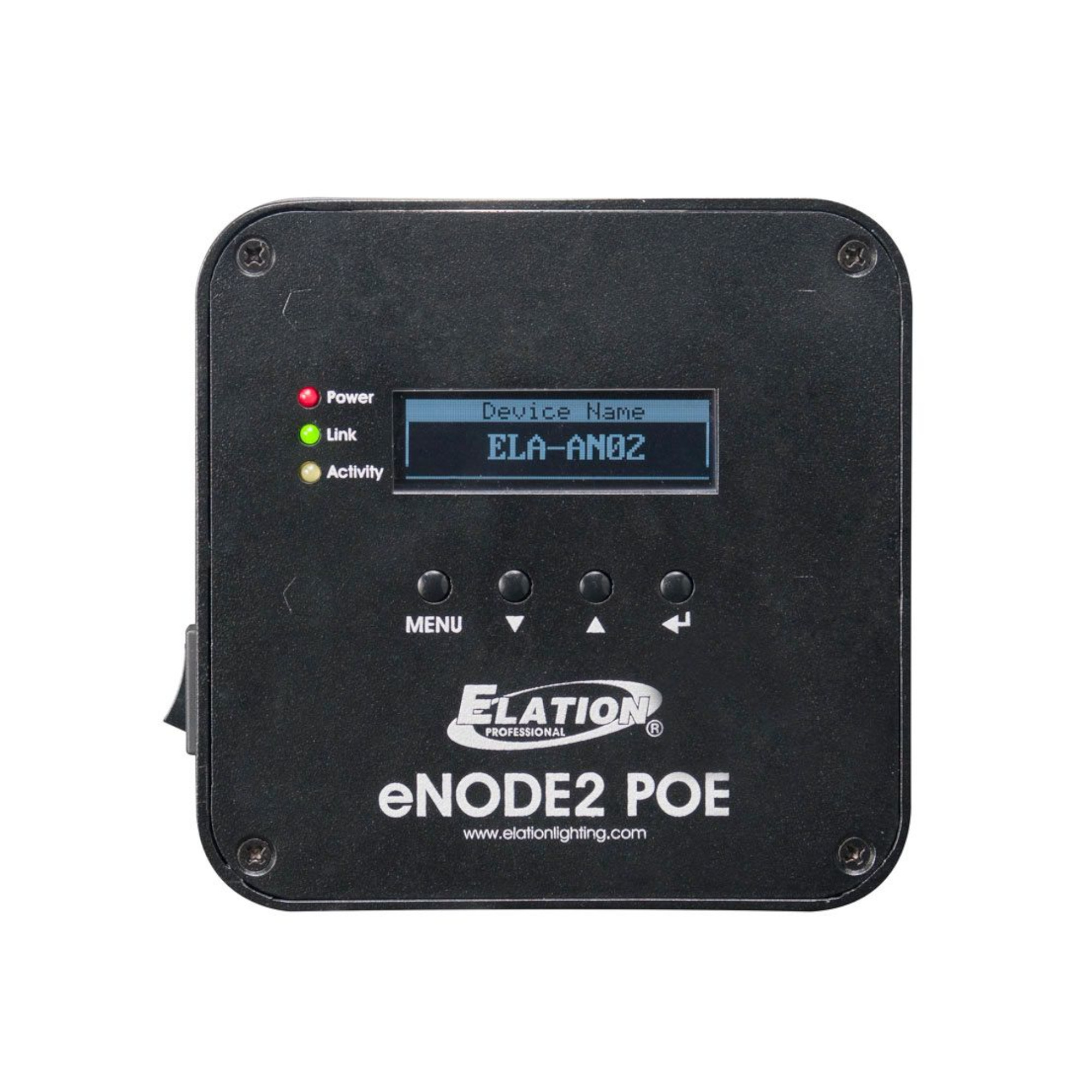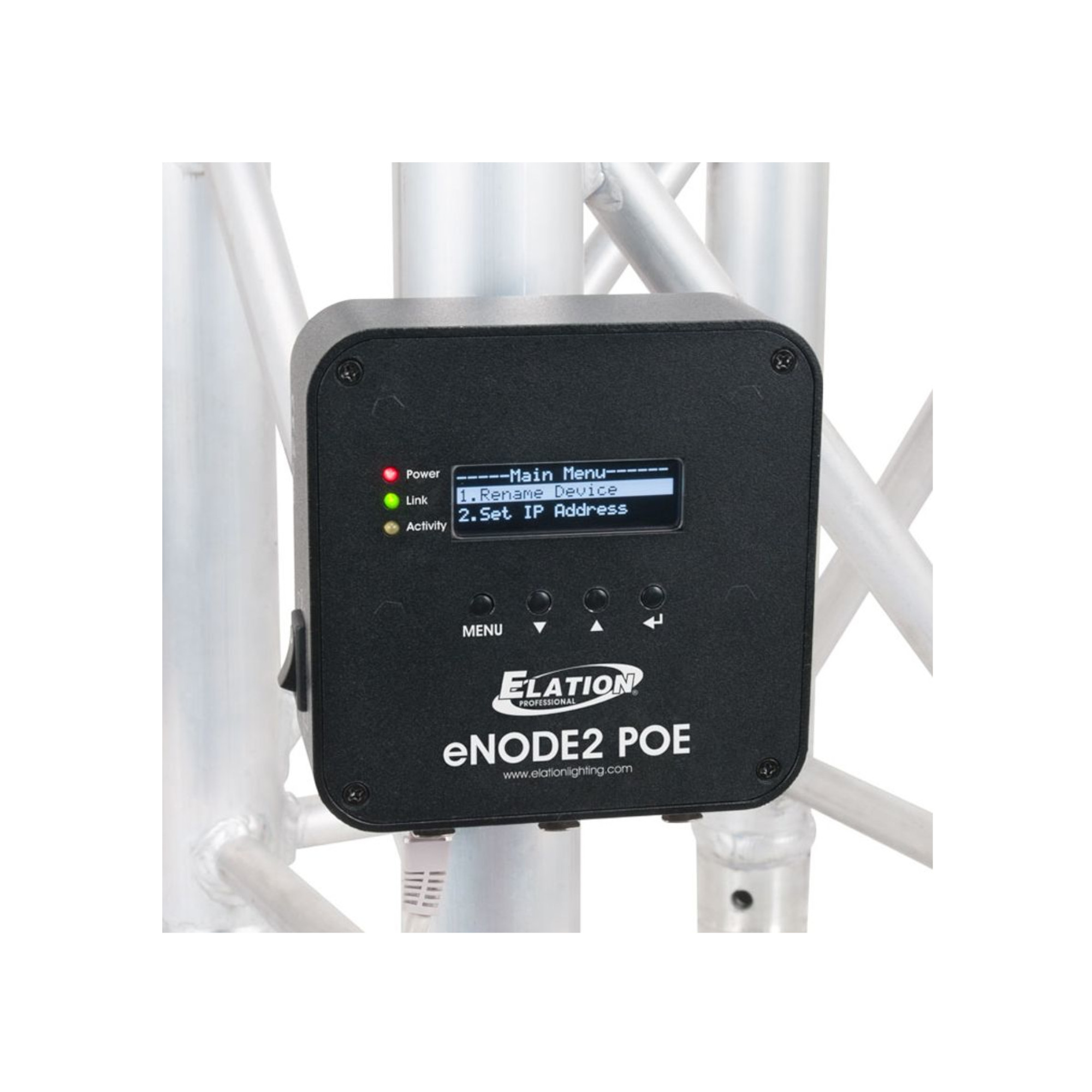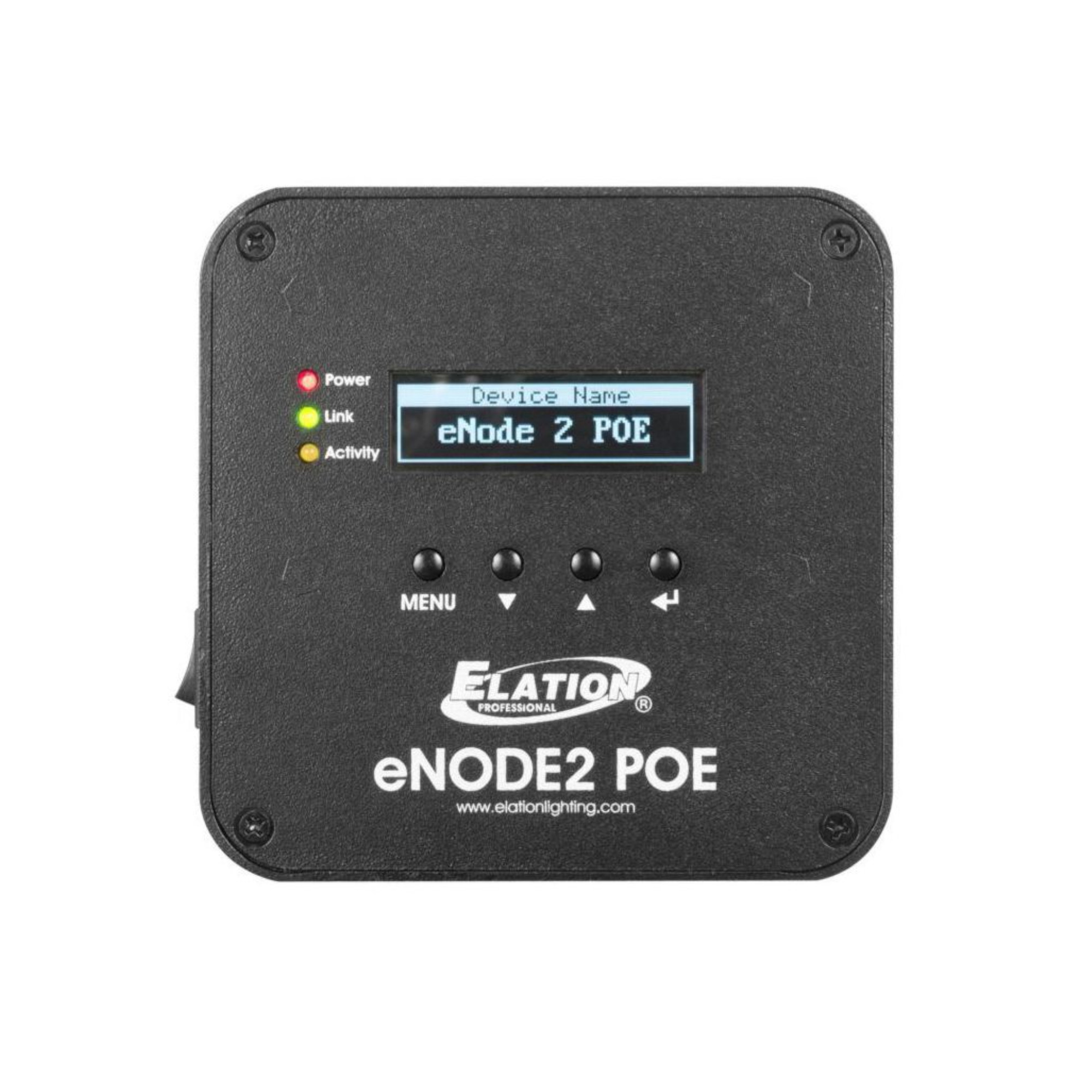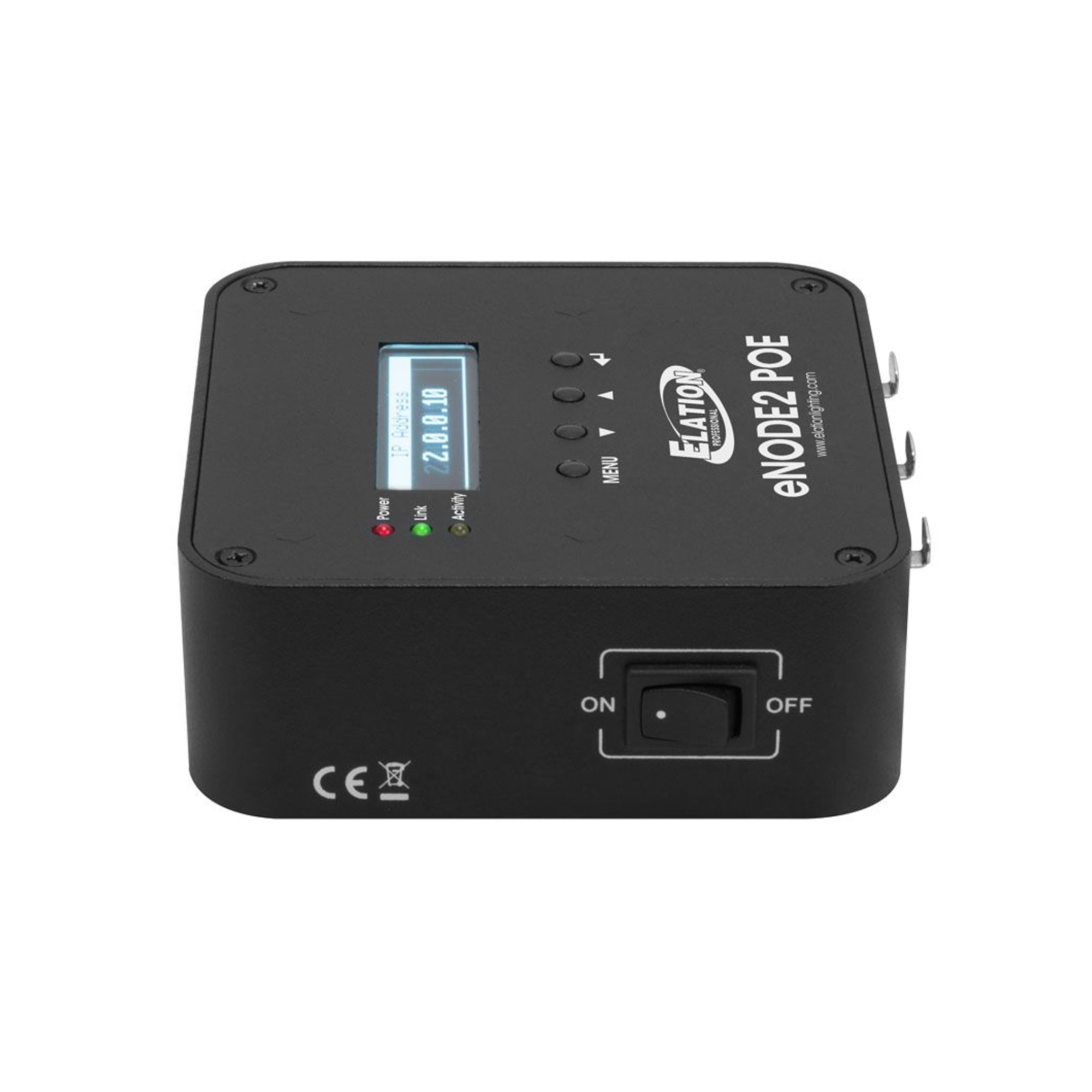 El eNode 2 POE es un nodo compacto Ethernet-DMX de 2 universos alimentado a través de Ethernet (POE™), no se necesita fuente de alimentación externa ni cable. Soporta sistemas de control DMX compatibles con Art-Net, sACN y RDM.
